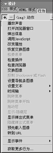 2. 選中圖片,單擊行為標簽,在此面板中,點擊“增加事件”按鈕,出現下拉菜單,如圖所示。